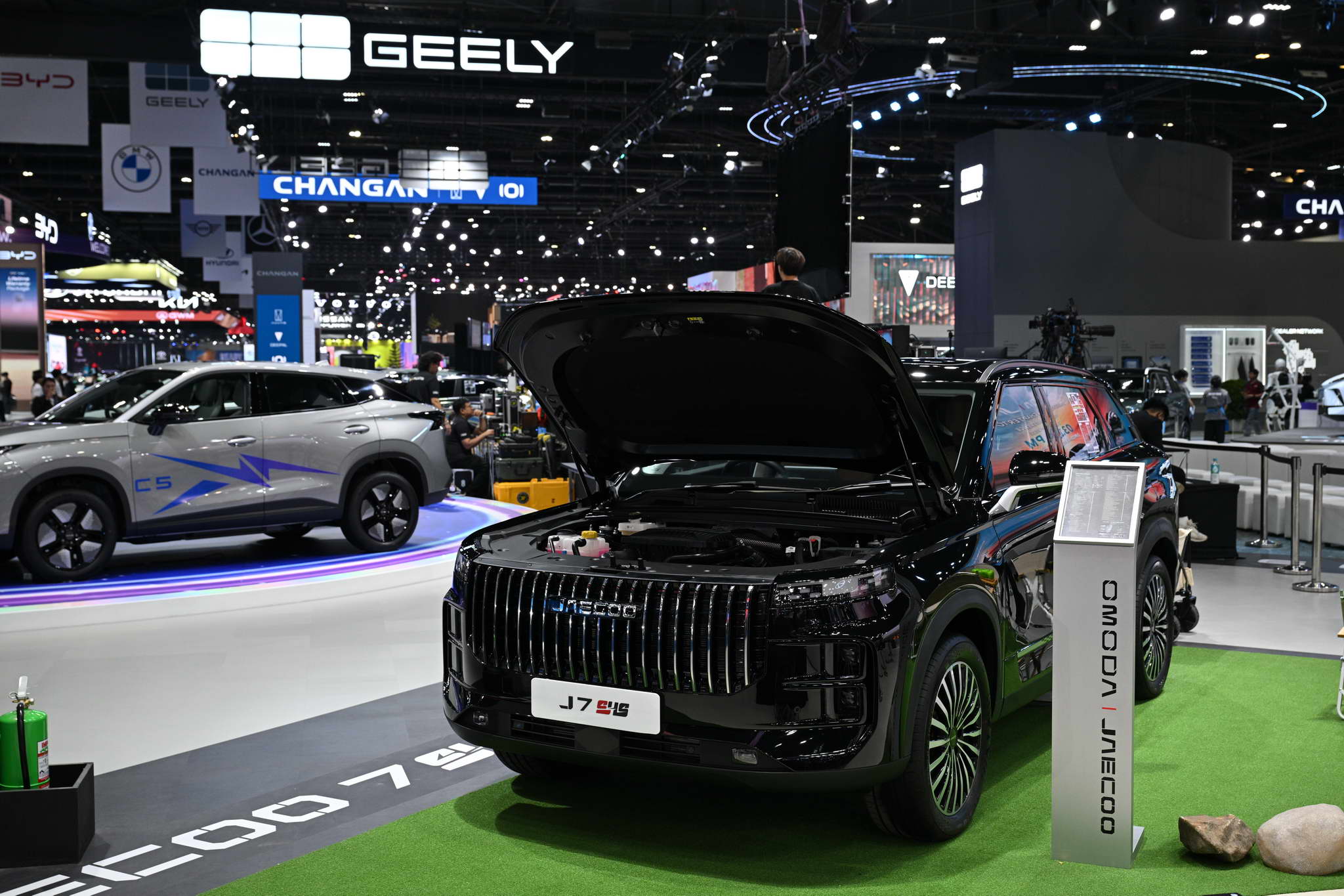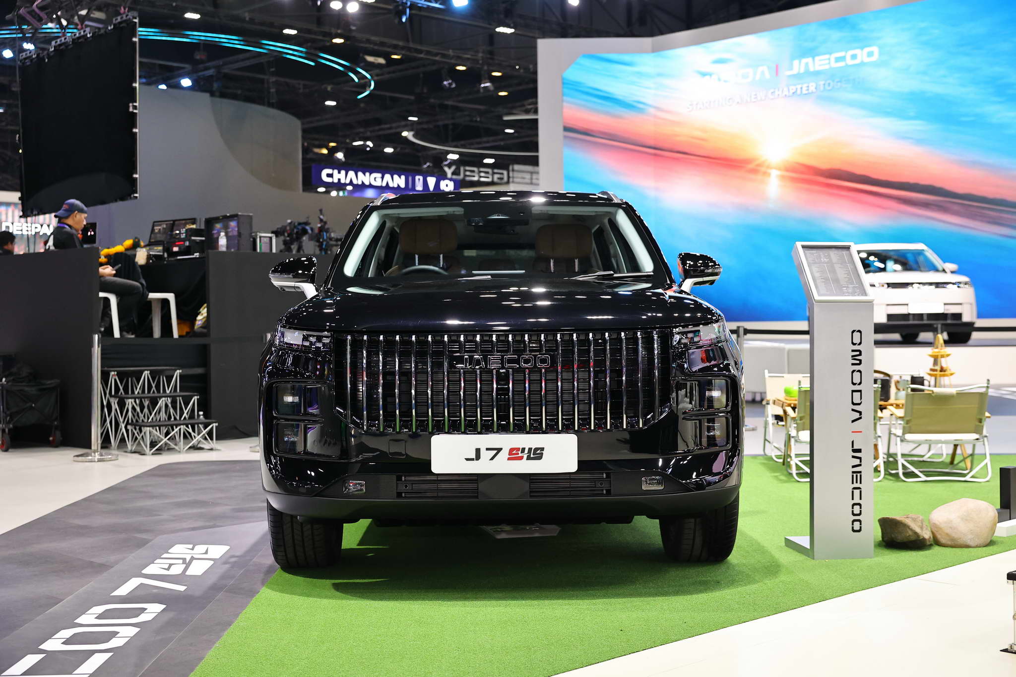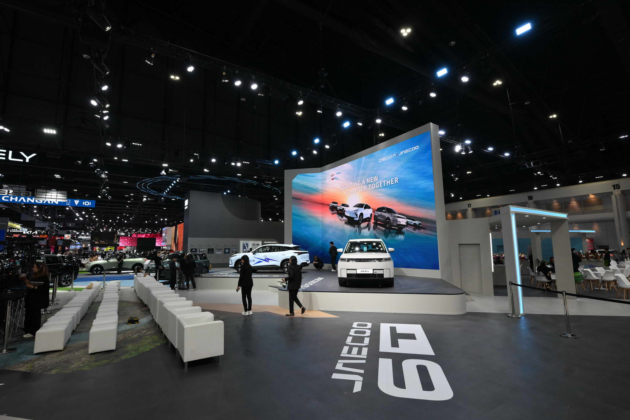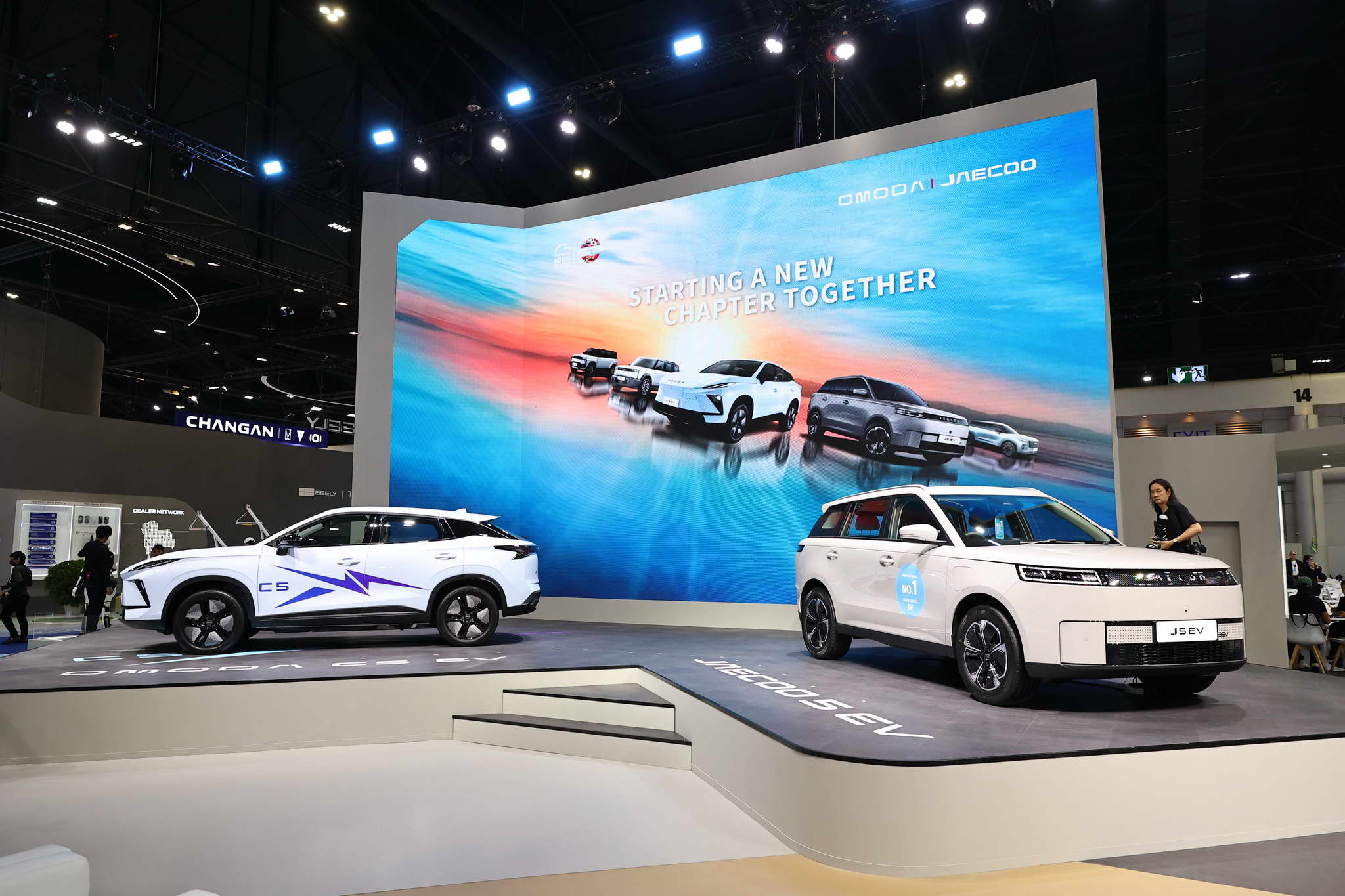 The vehicles displayed at the OMODA & JAECOO booth include the OMODA C5 EV MAX+, JAECOO 5 EV MAX+, JAECOO 6 EV, JAECOO 6T EV, and JAECOO 7 SHS.