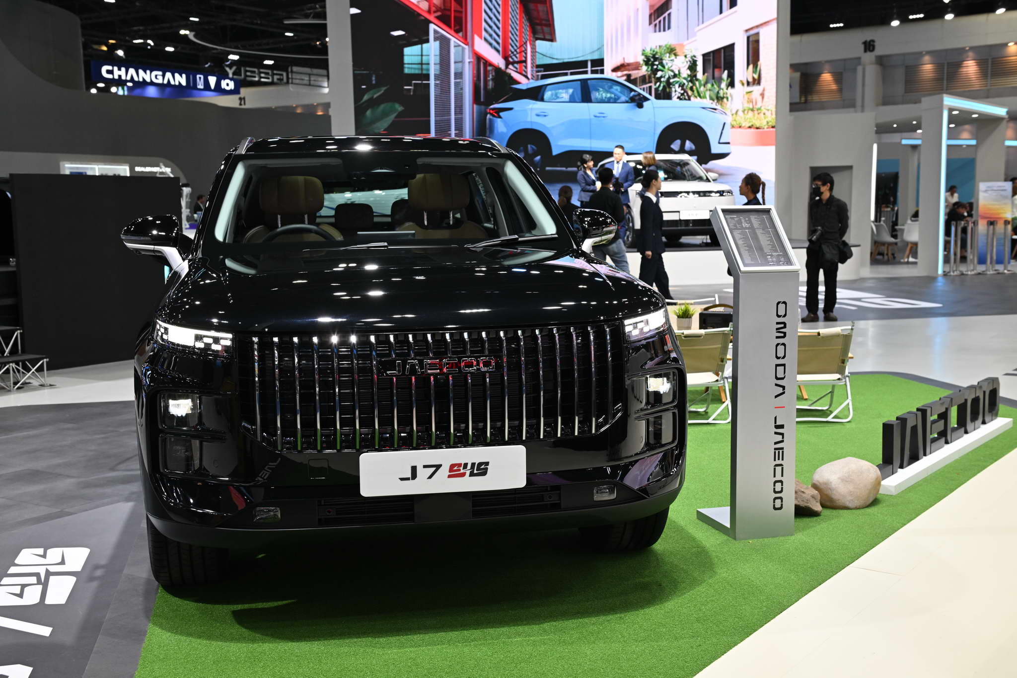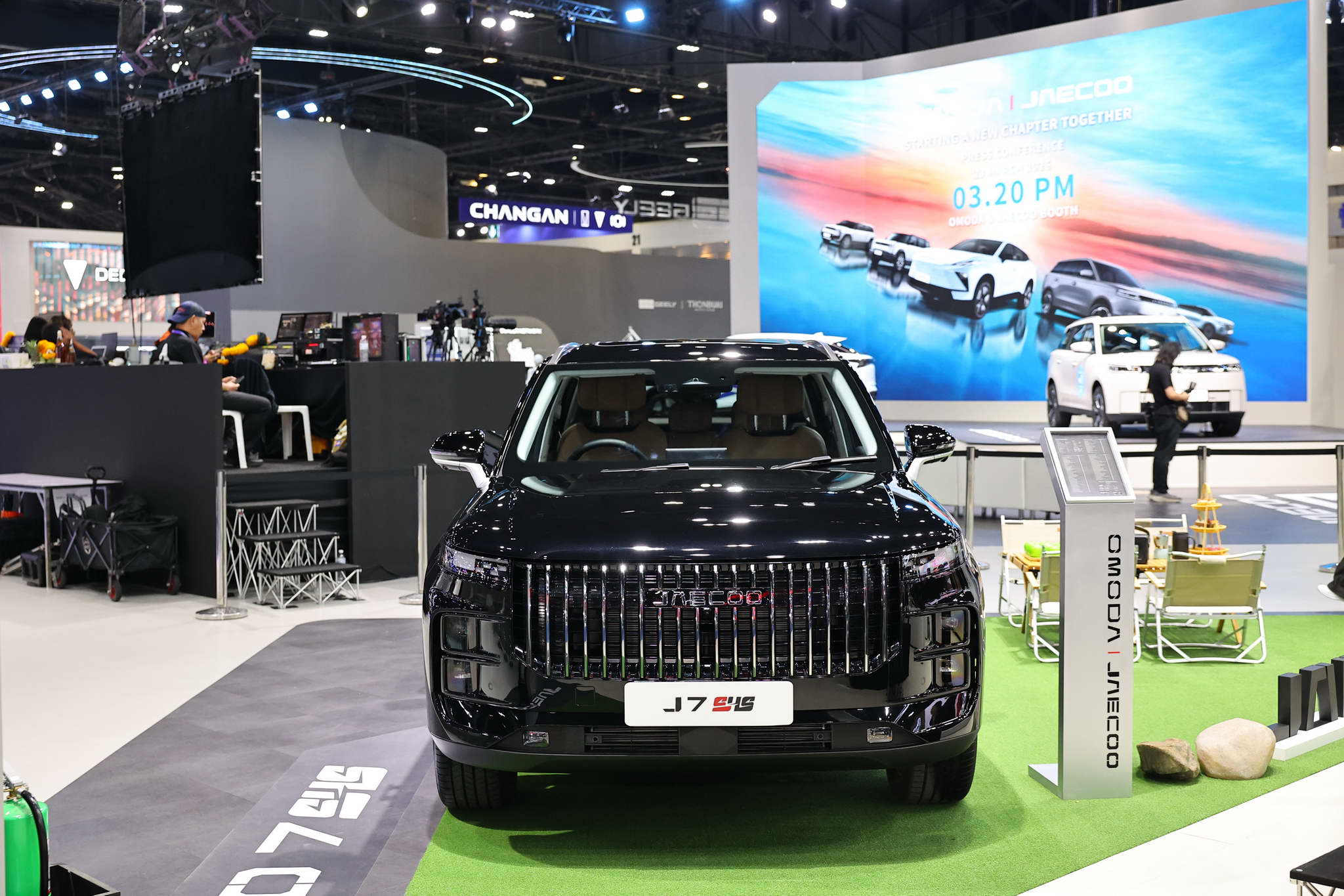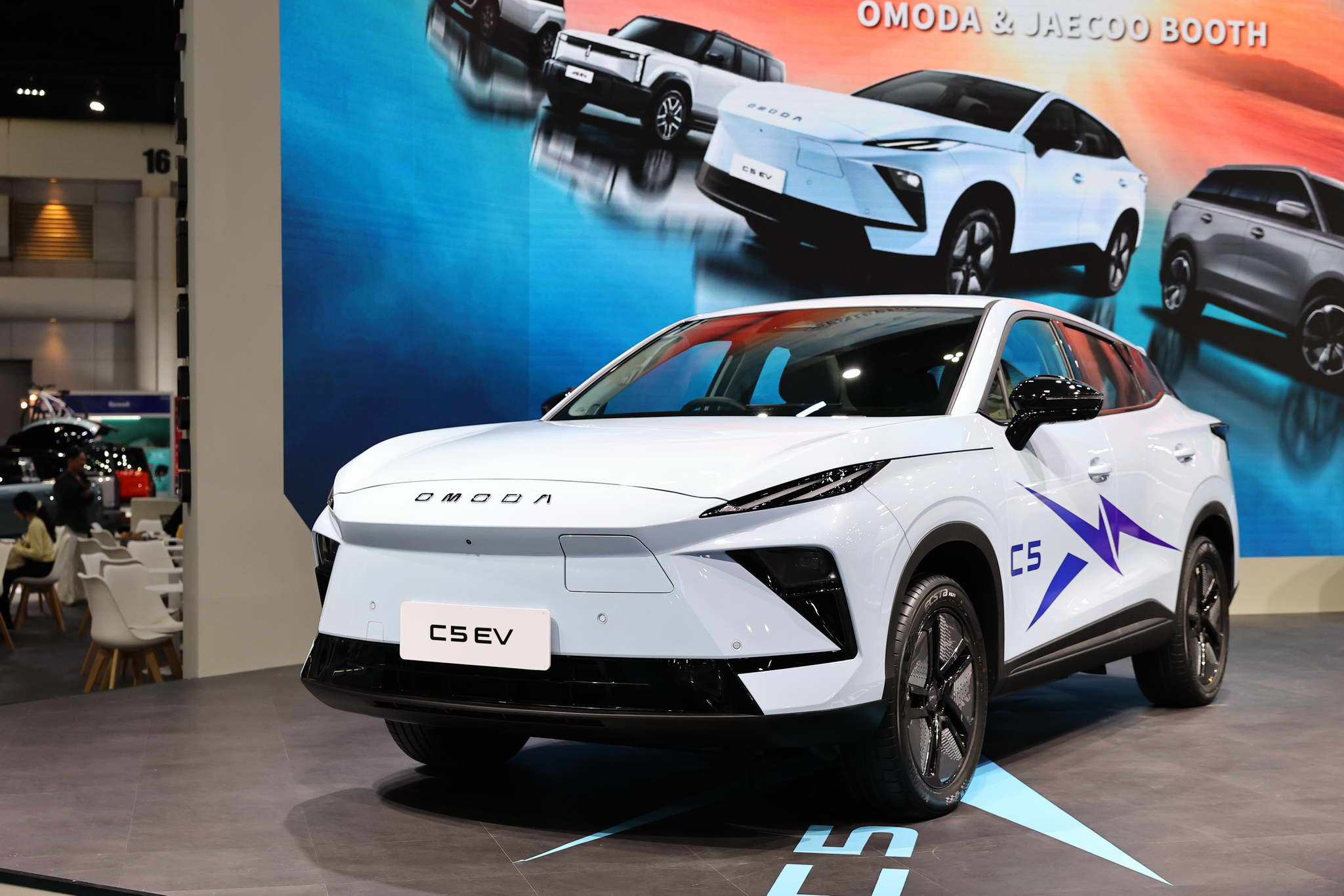 The vehicles displayed at the OMODA & JAECOO booth include the OMODA C5 EV MAX+, JAECOO 5 EV MAX+, JAECOO 6 EV, JAECOO 6T EV, and JAECOO 7 SHS.